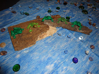 I started by using a piece of blue fabric and cut it into a general pond shape. I placed this on the floor and asked the Greenies what else we needed to make it a habitat for frogs? (BTW, the word habitat was introduced when we read the book Tadpole Trouble featuring Curious George.) The Greenies mentioned plants (represented by fish tank plants donated by a family,) water (represented by the fabric and the addition of glass rocks from the dollar store,) and rocks and logs. We had plenty of natural materials around our classroom, including a piece of log chewed by a beaver!